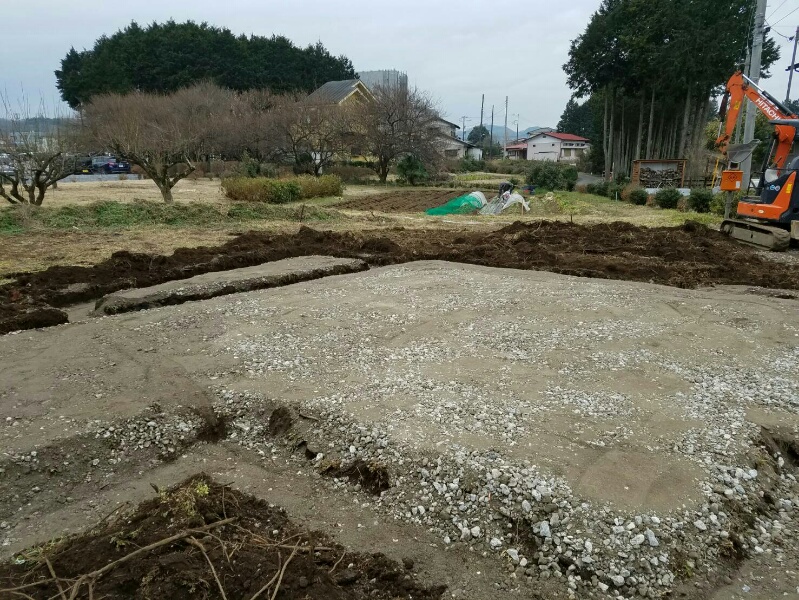 日高市 H様邸基礎工事2 2017.01.21 北風ピープーで、耳がちぎれそうなくらい寒い日が続きますが、職人達は元気いっぱいです。 日高市H様邸の基礎工事は、根切りをしてすてコンまで打ちました。 早いでしょ。