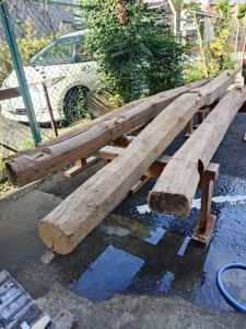 古材再生 2025.11.10 昨日と打って変わって、暖かく過ごしやすい日だなぁ~と思っていたら、強風吹きすさぶ忙しい天気でしたね。 本日は、十数年前に解体した古材を引っ張り出して水洗いをしました。 新しく建てる小屋梁として使います。 一番古い材木で明治時代に建築した材料ですので、伐採してから150年~140年前の材木ですね。 ほこりを洗い流して刻んであげれば再生できます。 木造建築のメリットですね。